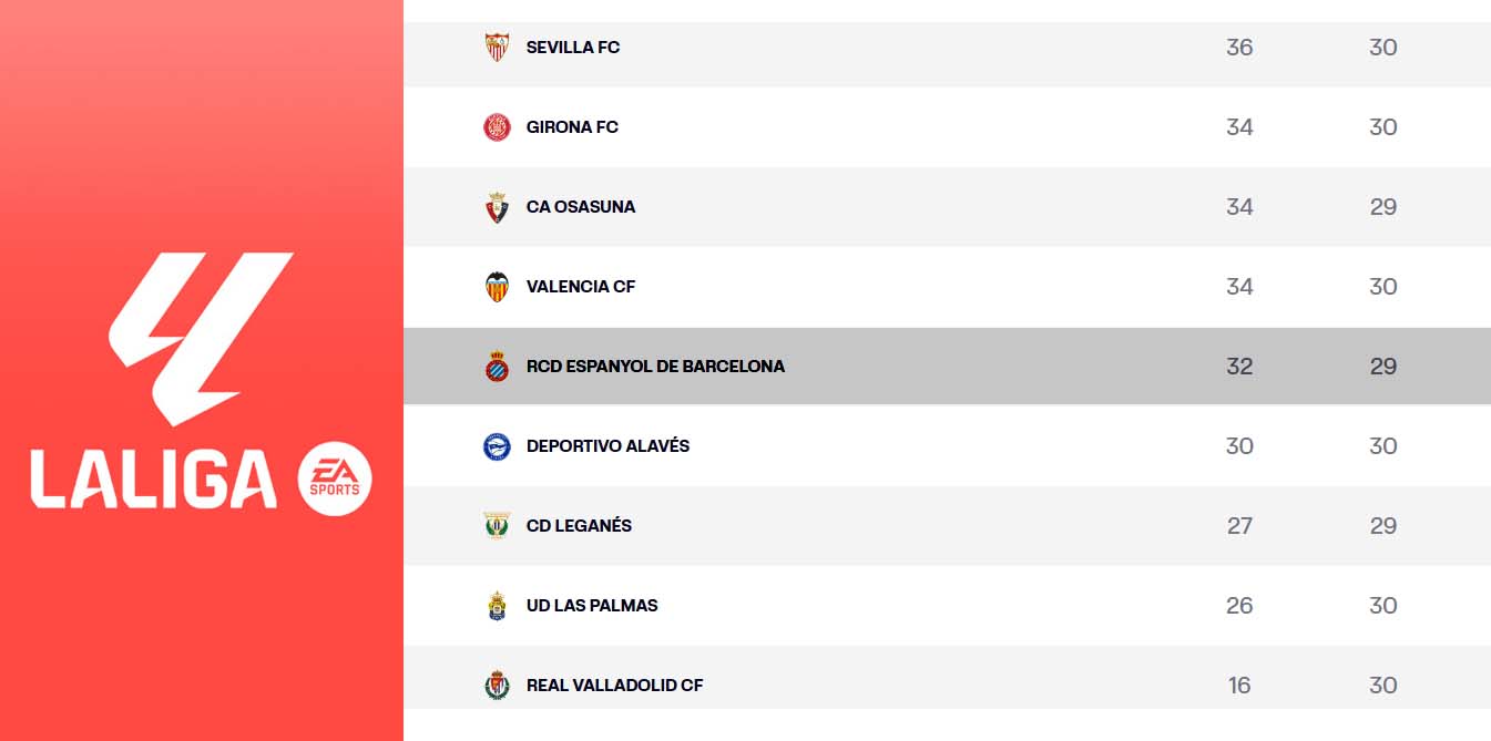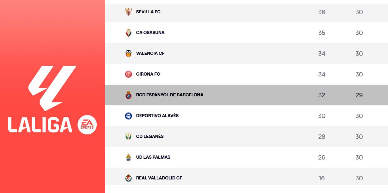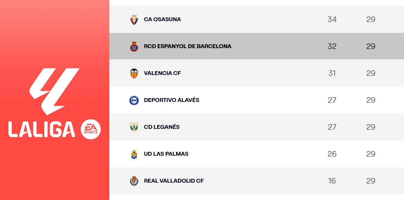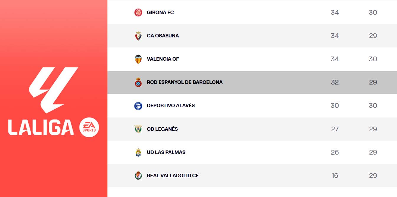 LaLiga EA Sports | El Espanyol dormirá este domingo a 5 puntos del descenso; el Leganés – Osasuna del lunes decidirá si sigue así o se reduce la distancia a dos