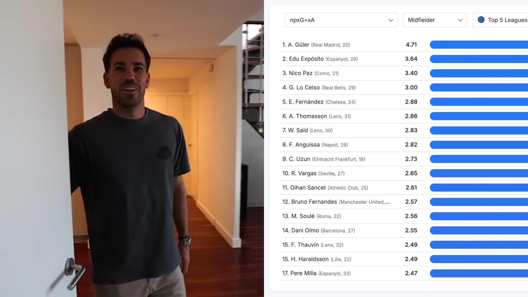 Pero lo más loco de todo es que Edu Expósito no solo destaca a nivel nacional. En la métrica avanzada npxG + xA, que mide cuántas ocasiones claras genera un jugador para sí mismo (sin penaltis) y para los demás, Edu aparece en el Top 5 de centrocampistas de las cinco grandes ligas europeas.