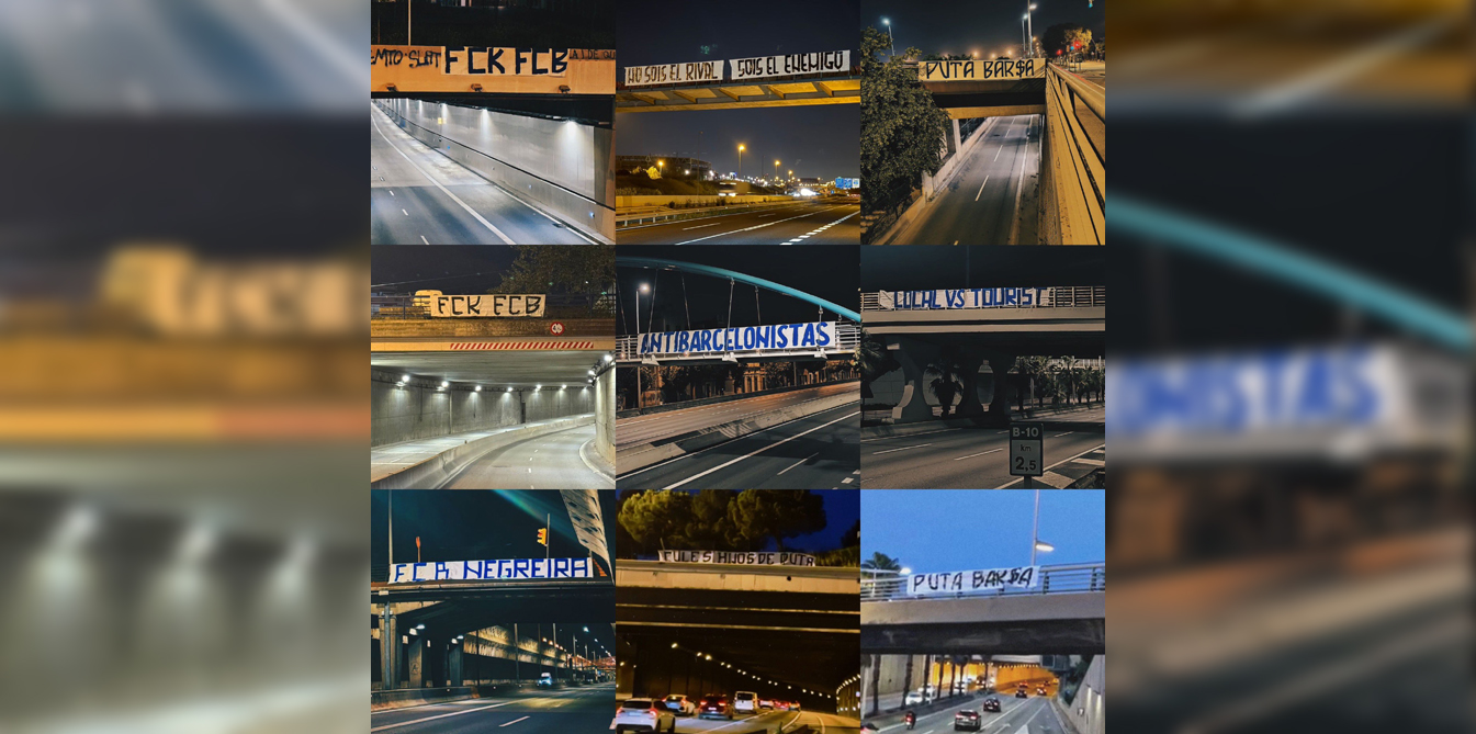 Los lemas, lejos de pasar desapercibidos, repiten el estilo habitual de otras ediciones del derbi: “FCK FCB”, “No sois el rival, sois el enemigo”, “Puta Barça”, “Antibarcelonistas”, “Local vs Tourist”, “FCB Negreira”, “Culés hijos de p…” o “P… Barça”. Frases directas y cargadas de contenido emocional, que apelan a la rivalidad más visceral entre aficiones.