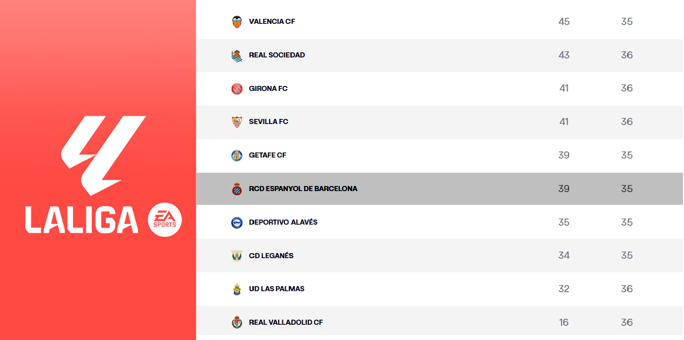 El Alavés, con 35 puntos, aún no está salvado y necesita puntos para evitar el descenso. El Valencia, con 45 puntos, está a dos del Rayo y del Mallorca y a cuatro del Celta, luchando por una plaza europea.
