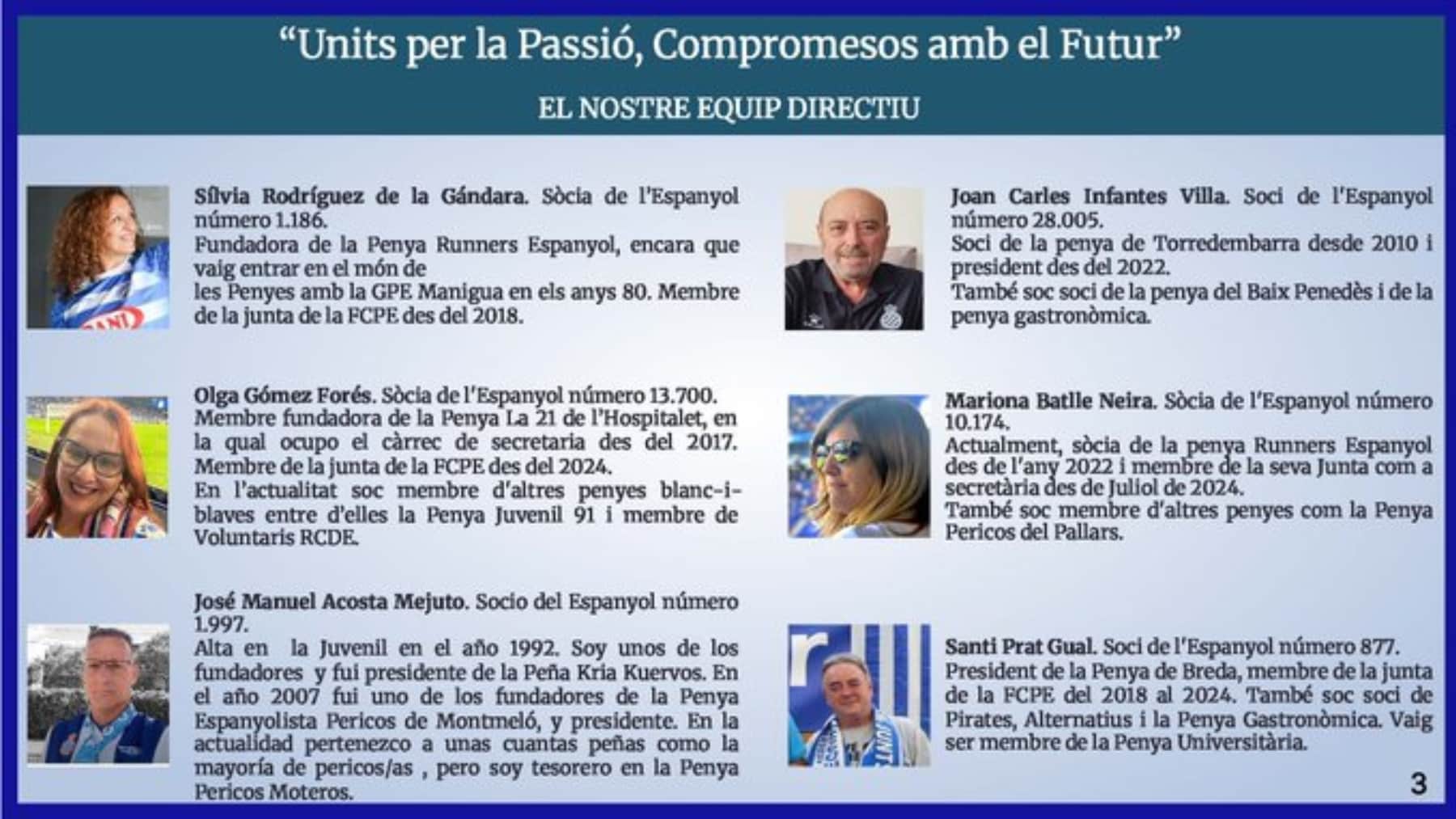 Completan el equipo Joan F. Clarà García, presidente de la Penya Blanc i Blava del Moianès y miembro de Komando Kria Kuervos, y Eva Campos Casado, integrante de la Penya Blanc i Blava de Sant Joan Despí, actualmente presidenta de la PBB desde mayo de 2025. Además, cuentan con la colaboración como asesor externo de Eduard Fernández Gironès, vicepresidente de la Penya Bubis de Alaior y miembro de la Gran Penya Manigua, una de las más emblemáticas del espanyolismo.