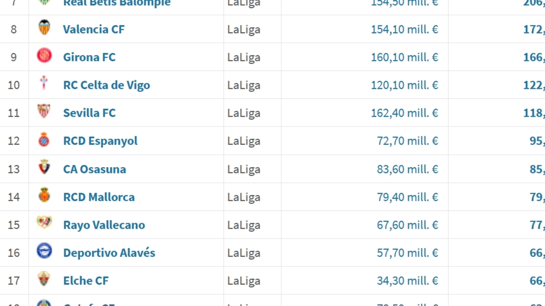 9 Girona FC LaLiga 160,10 mill. € 166,60 mill. € 4,1 %