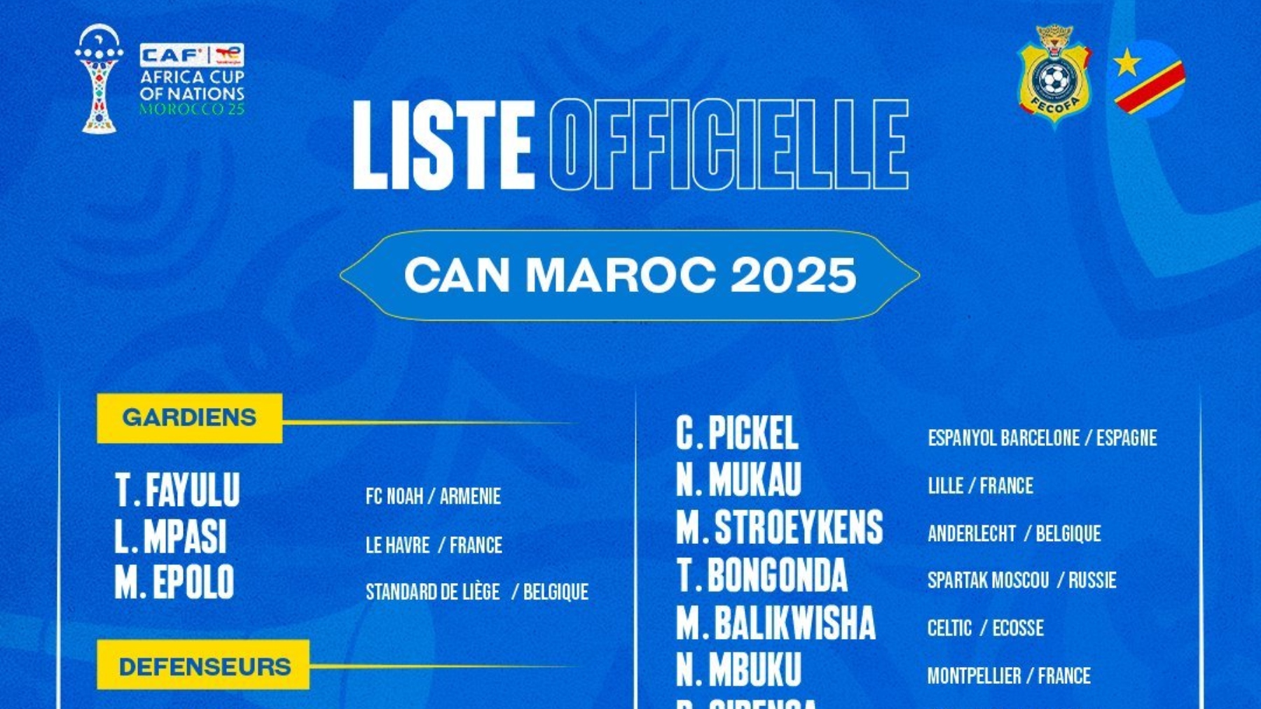 El Espanyol perderá durante varias semanas a uno de sus jugadores, y es que Charles Pickel ha sido convocado por la selección de la República Democrática del Congo de Sébastien Desabre para disputar la Copa Africana de Naciones que se celebrará en Marruecos entre el 21 de diciembre de 2025 y el 18 de enero de 2026. El mediocentro estaría fuera durante al menos cuatro jornadas de Liga, si su selección avanza en el torneo. Los congoleños jugarán en el Grupo D y disputarán su primer partido contra Benín en Rabat el 23 de diciembre. También se enfrentarán a Botsuana y Senegal en su grupo.